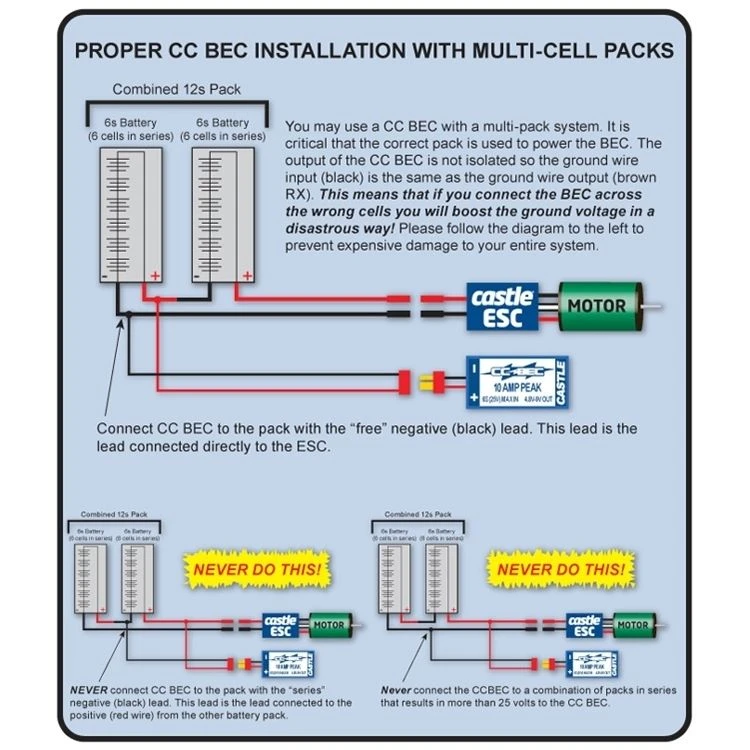 Product Use Statements: Read all wiring diagrams and usage advisories before using CC BEC Pro; PDF versions of the included manuals can be found on our support site. Not intended for use in wet conditions, BEC is not waterproof.