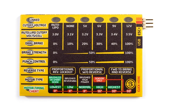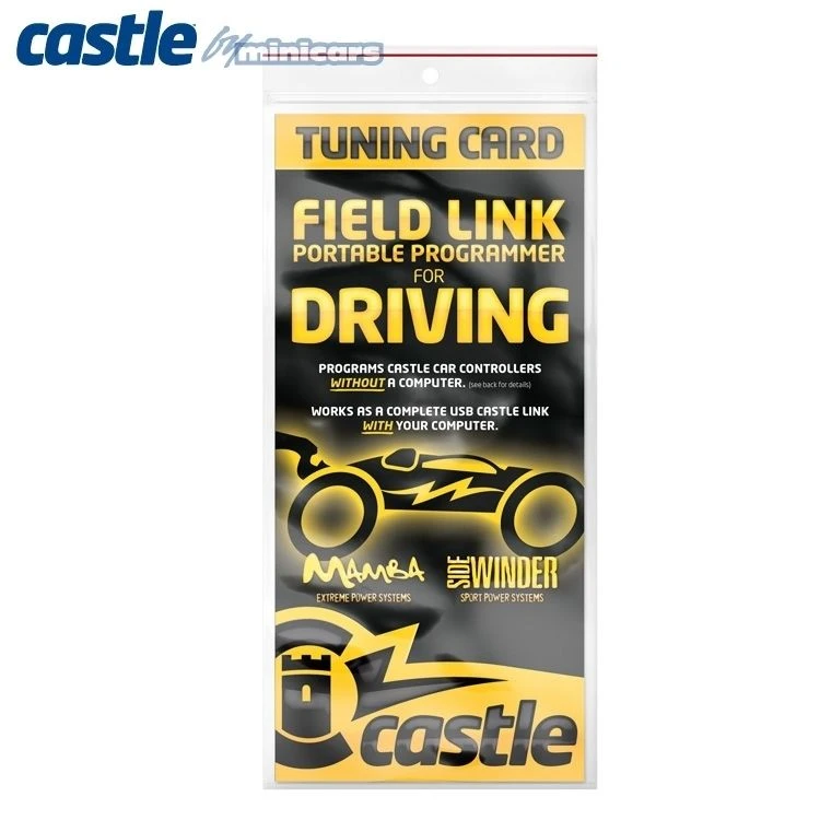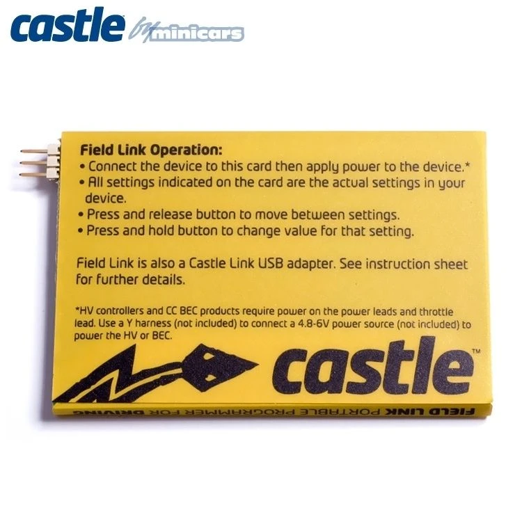 Field Link allows you to modify the most commonly used settings in your Castle Car controller all at the touch of a single button. No computer needed (mostly). Simply connect the Field Link to the throttle lead of the controller and power the pair as described.
