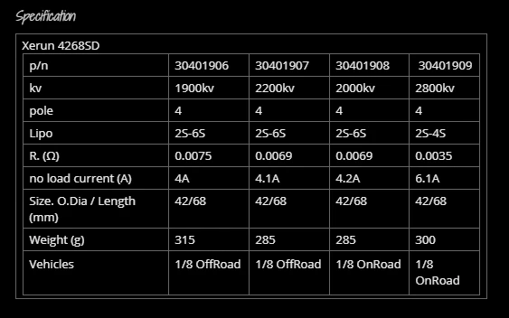 - 1900kv / 4 Pole / Lipo 2-6S / R. (Ω)0.0075 / no load current (A)4A / Weight 315(g) / Vehicles1/8 OffRoad