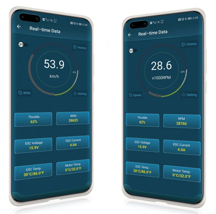 - Temperature and RPM of the ESC and motor by HW Link (OTA Programmer is needed to purchase), which is convenient for driver to analyze the running of the power system.