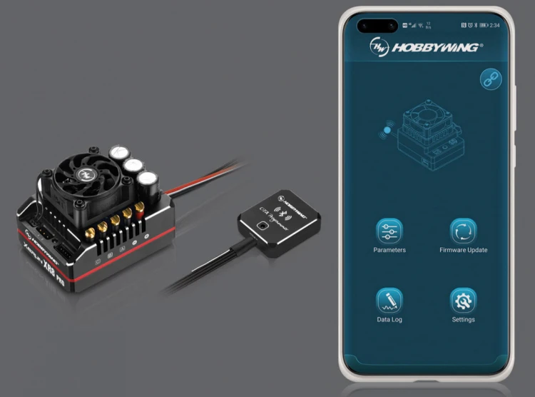 - Therecord function of real-time data:Open this function by connecting theESC with HW Link (OTA Programmer is needed to purchase) and mobile Appcan check throttle quantity, Voltage, Current, Temperature, RPM andother data in real time, and obtain the running status of the ESC andmotor.