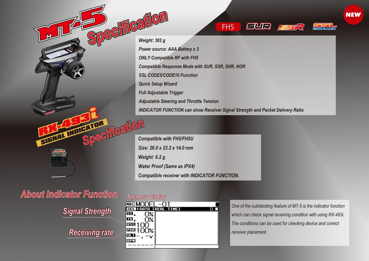 Combination with FH5 RF mode and SUR mode will give great smooth feeling.Compatible receivers are RX-491, RX492, RX-493, and RX-493i.(FH3 and FH4 compatible receivers as RX-38*, 45*, 46*, 47*, and 48* cannot be used for MT-5)